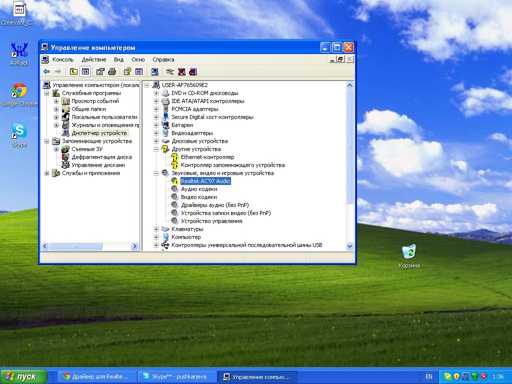Доброго времени суток ребят , такая проблема установил чистый Windows Xp Sp3 x32 на ноутбук,поставил драйверы на мат.плату,видеокарту и естественно звук.карту НО появилась вот такая проблема в диспетчере устройств где Звуковы,видео и игровые устройства появился восклицательный знак на Realtek AC'97 Audio и поэтому и отсутствует звук... перепробовал все ничего не помогает... Надеюсь на вашу помощь!