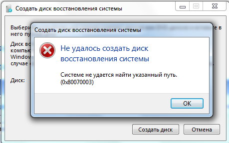 при попытке создать ДИСК ВОССТАНОВЛЕНИЯ СИСТЕМЫ из под Windows 7, выскакивает сообщение: