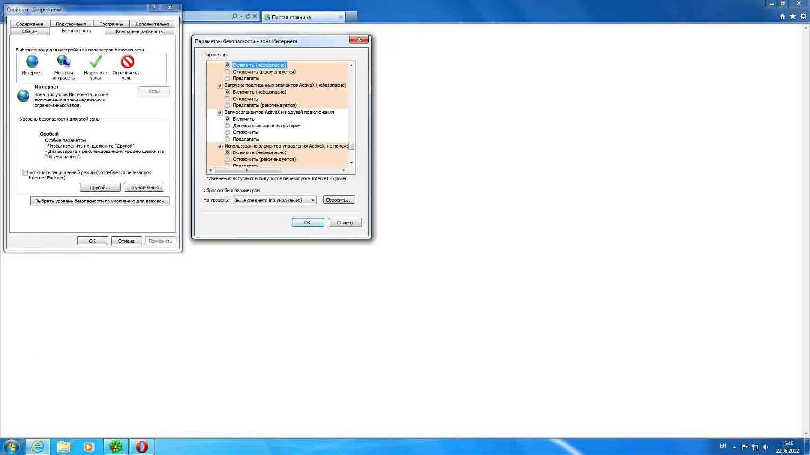 Здравствуйте. При попытке залогиниться на сайт http://rts-tender.ru/ через IE, с нужными параметрами безопасности, IE по прежнему блокирует загрузку мелких надстроек с сайта. Добавлено в надежные узлы + установлены необходимые настройки ActiveX. Подскажите, как вообще отключить эту защиту в IE? Чтобы необходимые параметры ActiveX не обозначались "красным". Я думаю дело в этом. Скрины во вложении