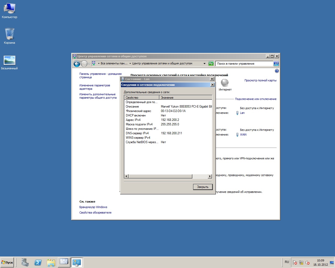 Ситуация в следующем: настроил TMG на Win Serv 2008, настало время ставить его на место, но тут беда... В локальную сеть доступ есть, а в Интернет нет! Наставник говорит что нужно настроить "белую" сетевуху.... на первом скрине все сведения по "белой" сетевухе, на втором по внутренней если нужно... Если какие то вопросы есть задавайте, отвечу по мере своих знаний.. Объясните дилетанту, не хочу руководителя подставлять... Заранее огромное спасибо!!! |