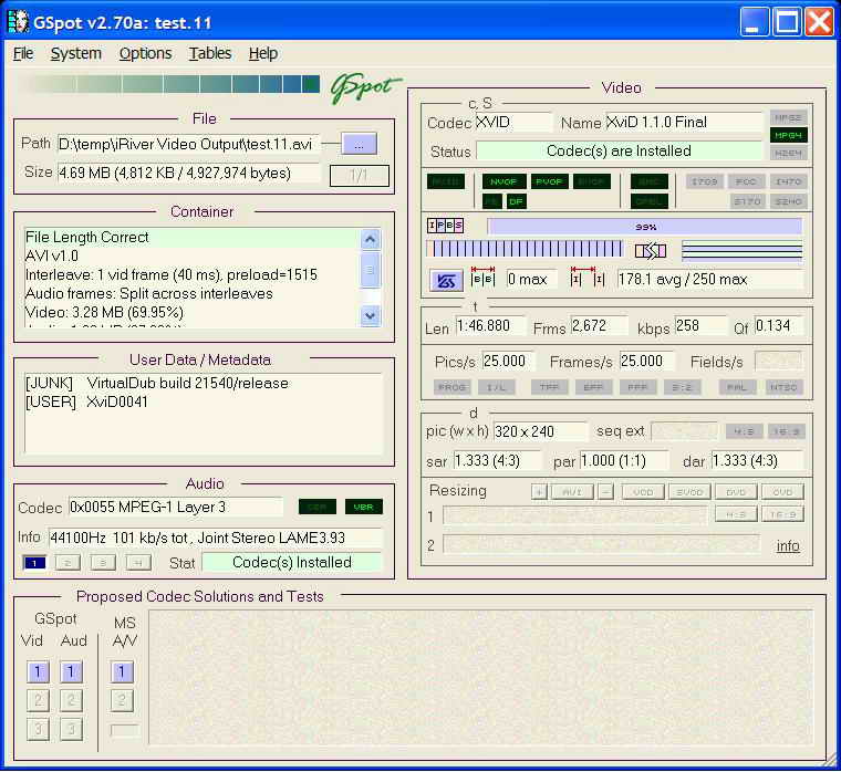 Хочу научится кодировать на плеер в VirtualDubе. Но сколько не пробовал - не получается -) Обычно кодирую на него программой iriverter, но она не настолько функциональна, как хотелось бы. Я пробовал смотреть на закодированный iriverteroм видеофайл в программе gspot(входит в k-lite codec-pack), ставить тот же кодек (версию аналогичную) и кодировать в Дабе, и все равно плеер не воспроизводит. Вопрос - как имея видеофайл, который плеер воспроизводит, настроить кодек так, чтоб закодировать видео в виртуалдабе, чтоб и его мой плеер смог воспроизвести ? какие настроить кодек ? ещё плеер поддерживает divx. Если нужно, могу скинуть скрин gspota с divx файлом который он может воспроизвести. вот пример для сравнения. 1-1.00.avi плеер воспроизводит, а test.11.avi - нет. [IMG]D:\temp\gspot_2.jpg[/IMG] |