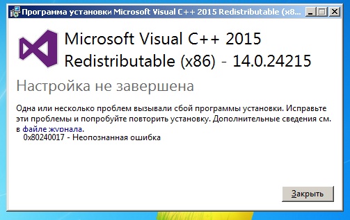 | Установка - 0x80240017 при установке Microsoft Visual C++ 2015 x86 | therosty@vk | Microsoft Windows 8 и 8.1 | 70 | 09-10-2016 20:33 | |