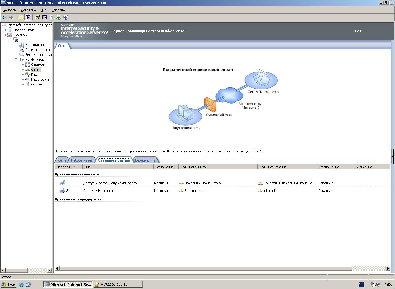 На Microsoft Server 2003R2 две сетевые карты. Одна смотрит в интернет, другая во внутреннюю сеть. Если утрировать то выглядит это так - (Local - IP - 192.168.0.1/24/GA - none/DNS - none) и (Net - IP - 192.168.100.100/24/GA - 192.168.100.1/DNS - 192.168.100.1). До установки ISA простой ICS прекрасно справлялся с задачей маршрутизации (То есть из внутренней сети был полноценный доступ в интернет). После установки ISA 2006 - Пинг проходит только до сайта (Например ya.ru), схватывает его IP, но назад пакеты не возвращаются. POP и SMTP тоже не работают. Зато через HTTP без проблем можно лазить в интернете. Вопрос: Как настроить ISA 2006 чтобы у клиентов был полноценный доступ к интернету? P.S. - TCP/IP Конфиг клиентов - (IP - 192.168.0.X/24/GA - 192.168.0.1/ DNS - 192.168.0.1) |