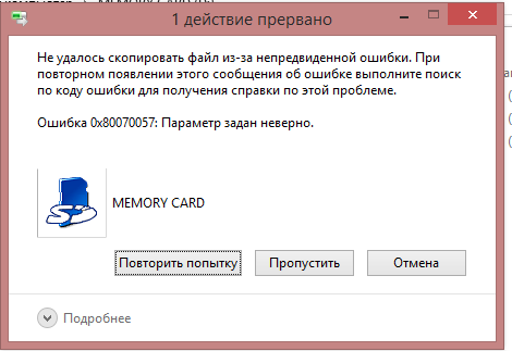 при копировании файла с системного диска на флеш карту выдает ошибку 0x80070057, на другом ноуте флеш карта работает без проблем, виндовс 8.1 32 разр