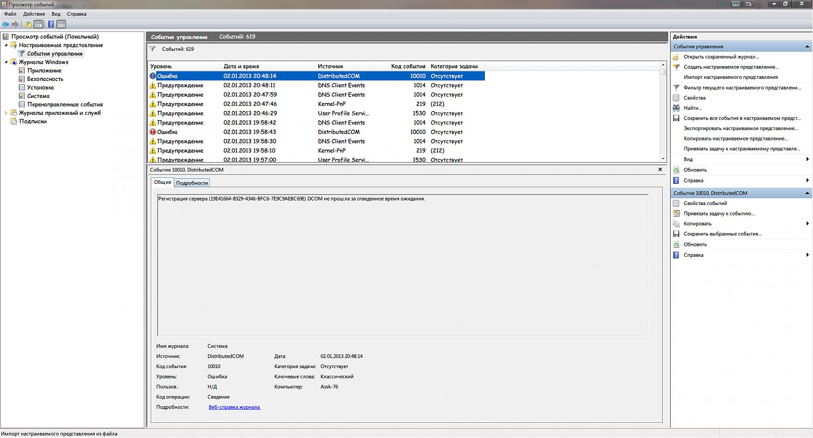 В подробностях событий написано это - System - Provider [ Name] Microsoft-Windows-DistributedCOM [ Guid] {1B562E86-B7AA-4131-BADC-B6F3A001407E} [ EventSourceName] DCOM - EventID 10010 [ Qualifiers] 49152 Version 0 Level 2 Task 0 Opcode 0 Keywords 0x80000000000000 - TimeCreated [ SystemTime] 2013-01-02T18:48:14.000000000Z EventRecordID 19234 Correlation - Execution [ ProcessID] 0 [ ThreadID] 0 Channel System Computer Assk-76 Security - EventData param1 {19E41664-8329-4346-BFC6-7E9C9AEBC69E} |