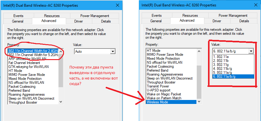 вот тут справа сверху можно кликнуть по спецификациям Ноут, Lenovo T460. Intel(R) Dual Band Wireless-AC 8260. Драйвер v.19.50.1.6 от 01.06.2017 (спецификации) Когда ноут подключаешь к сети, все отлично. speedtest показывает порядка 45-50 Мбит (тариф 50 Мбит). Вечером прихожу с работы (ноут с собой ношу) и подключаюсь снова - speedtest падает до 3 Мбит. Перегружаешь роутер - не помогает. Перегружаешь комп - все отлично. Телефон, в любо время показыват стабильно хороший результат. Если ноут уходит в спячку и после подключается снова к домашней сети - все работает хорошо. т.е., я так понимаю, что если подключаешься к любой другой сети (не домашней), то потом обратно к своей подключиться нормально не может. Кто сталкивался? Какие доп данные нужны для анализа? Докопаться до причины не удалось. ну и чтобы двараза не вставать, вопрос на второй картинке (по свойствам сетевого адаптера на компе) |