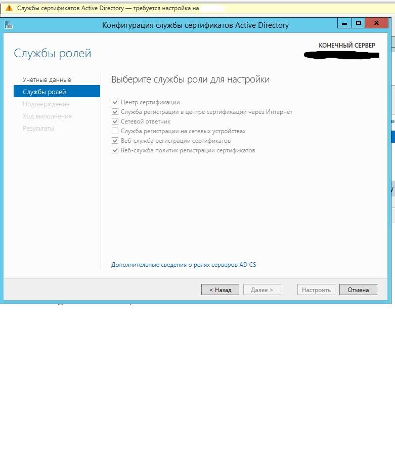 Добавляю роль центра сертификации на контроллере домена, роль добавилась, но в диспетчере сервера висит предупреждение : службы сертификатов Active Directory - требуется настройка. В мастер на стройки указываю учетные данные, учетка входит в администраторы домены и администраторы предприятия, учетные данные принимаются, а следующий шаг - выберите службы роли - все серое и неактивное что делаю не так? |