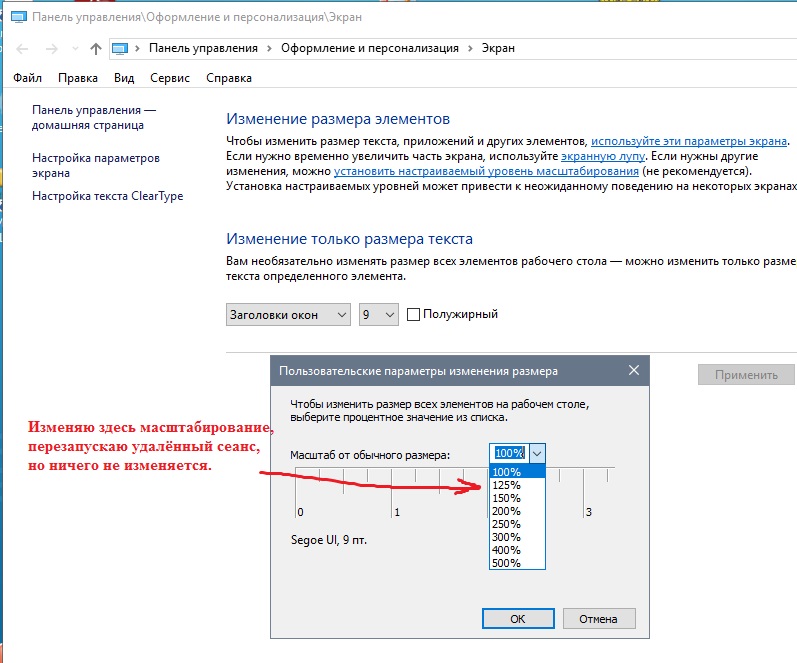 Разрешает изменение масштаба для всего сервера: Goto „HKEY_LOCAL_MACHINE\SYSTEM\CurrentControlSet\Control\Terminal Server\WinStations\IgnoreClientDesktopScaleFactor“ => if IgnoreClientDesktopScaleFactor does not exist then create a new DWORD-value => Type in Decimal Value: Turn on 1 (Turn off 0) Выбор масштаба для текущего пользователя: Goto „HKEY_CURRENT_USER\Control Panel\Desktop\LogPixels“ => if LogPixels does not exist then create a new DWORD-value => Type in Decimal Value: 96 for Smaller 100% 120 for Medium 125% 144 for Larger 150% И батник для удобства пользователей: Скрытый текст