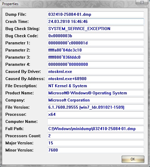 Рядом, там также находится еще одна критическая ошибка, но в ней нету кода 0x000000003b - её также прикрепляю в приложения (2.jpg). Пункт 3, дамп мини-базы - в приложение, dump.rar Пункт 4, конфигурация - в приложение, audit_hardware.rar - сделал при помощи программы WinAudit. Заранее благодарю за помощь в решение проблемы. Хочу отметить что не всегда появляется синий экран, иногда просто сразу идёт перезагрузка. С уважением, Виталик. |