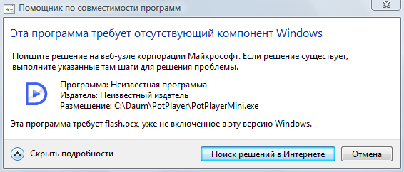 Профиль | Отправить PM | Цитировать Установил программу Daum PotPlayer 1.5.26481 на Vista, операционная система 32-разрядная. Работает отлично, но при закрытии окна выскакивает сообщение; эта программа требует отсутствующий компонент Windows (flasf.ocx), так как он не включен в эту версию Windows. Куда бы я его не ставил-результат тот же. Может кто посоветует, что делать?