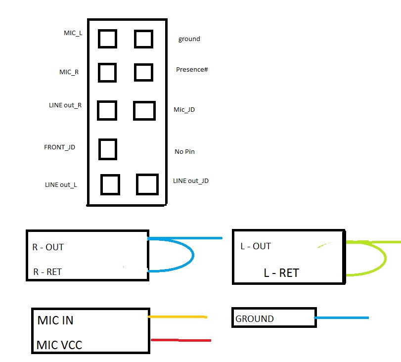 Pin Signal Name Function 1 AUD_MIC Front Panel Microphone input signal Выход микрофона на переднюю панель 2 AUD_GND Ground used by Analog Audio Circuits Земля, масса, минус - как хотите ![]() 3 AUD_MIC_BIAS Microphone Power Что то связанное со смещением звука на микрофоне, надеюсь кто то более точно сообщит. 4 AUD_VCC Filtered +5 V used by Analog Audio Circuits 5 вольт питания для звука 5 AUD_FPOUT_R Right Channel Audio signal to Front Panel Выход правого канала на переднюю панель 6 AUD_RET_R Right Channel Audio signal to Return from Front Panel Вход правого канал на переднюю панель 7 HP_ON Reserved for future use to control Headphone Amplifier Зарезервировано для использования в будущем 8 KEY No Pin Бестолковый контакт ![]() 9 AUD_FPOUT_L Left Channel Audio signal to Front Panel Выход левого канала на переднюю панель 10 AUD_RET_L Left Channel Audio signal Return from Front Panel Вход левого канала на переднюю панель Звук - что, куда? подключение: