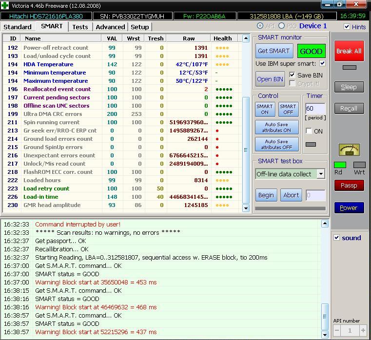 Скажите, сильно ли плох этот винт? ST3160815AS 6RA0P8AE ------------------------------------------------------------------------- ID Name Value Worst Tresh Raw Health ------------------------------------------------------------------------- 1 Raw read error rate 116 92 6 107285869 ••••• 3 Spin-up time 99 97 0 0 •••• 4 Number of spin-up times 92 92 20 8867 •••• 5 Reallocated sector count 100 100 36 0 ••••• 7 Seek error rate 84 60 30 296787115 •••• 9 Power-on time 89 89 0 9714 •••• 10 Spin-up retries 100 100 97 0 ••••• 12 Start/stop count 92 92 20 8840 •••• 187 Reported UNC error 1 1 0 836 • 189 High Fly writes 100 100 0 0 ••••• 190 Airflow temperature 61 47 45 39°C/102°F •••• 194 HDA Temperature 39 53 0 39°C/102°F •••• 194 Minimum temperature 90 53 0 10°C/50°F - 195 Hardware ECC recovered 79 67 0 136629368 ••• 197 Current pending sectors 99 98 0 28 •••• 198 Offline scan UNC sectors 99 98 0 28 •••• 199 Ultra DMA CRC errors 200 200 0 0 ••••• 200 Write error rate 100 253 0 0 ••••• 202 DAM errors count 99 252 0 1 •••• 187 Reported UNC error 1 1 0 836 • |