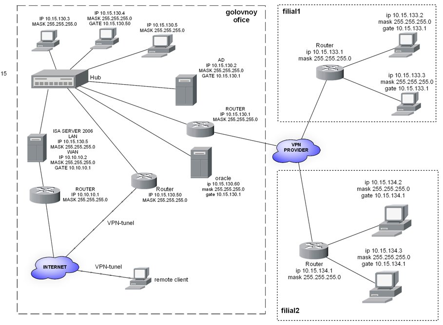 машины головного офиса 10.15.130.3 и 10.15.130.5 выходят в интернет через ISA Server и роутер 10.10.10.1.