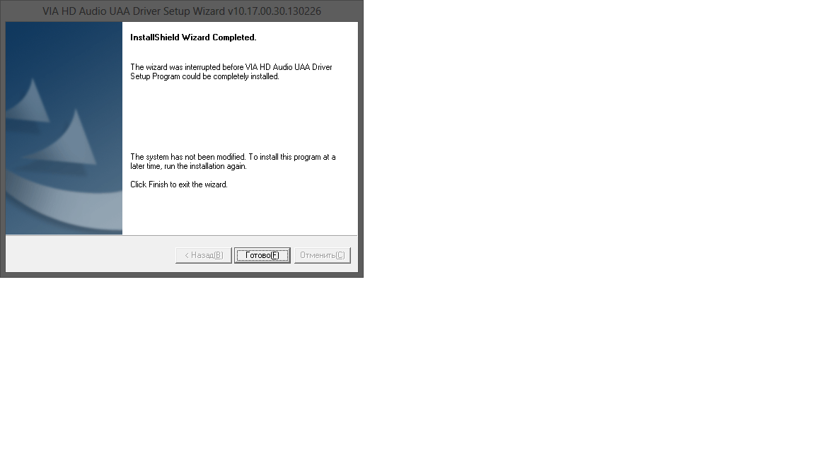 Возникает ошибка regdbcreatekeyex failed при попытке установки via hd audio driver. Сами драйвера устройства устанавливаются через диспетчер устройств, но ни микрофон, ни выбор каналов через стандартное приложение винды не работает. Качал множество версий драйверов от via, у всех эта ошибка. Панель от реалтека тоже не ставится. В безопасном режиме так-же ошибка установки, все остатки дров чистил. Посоветуйте что тут можно сделать? |
