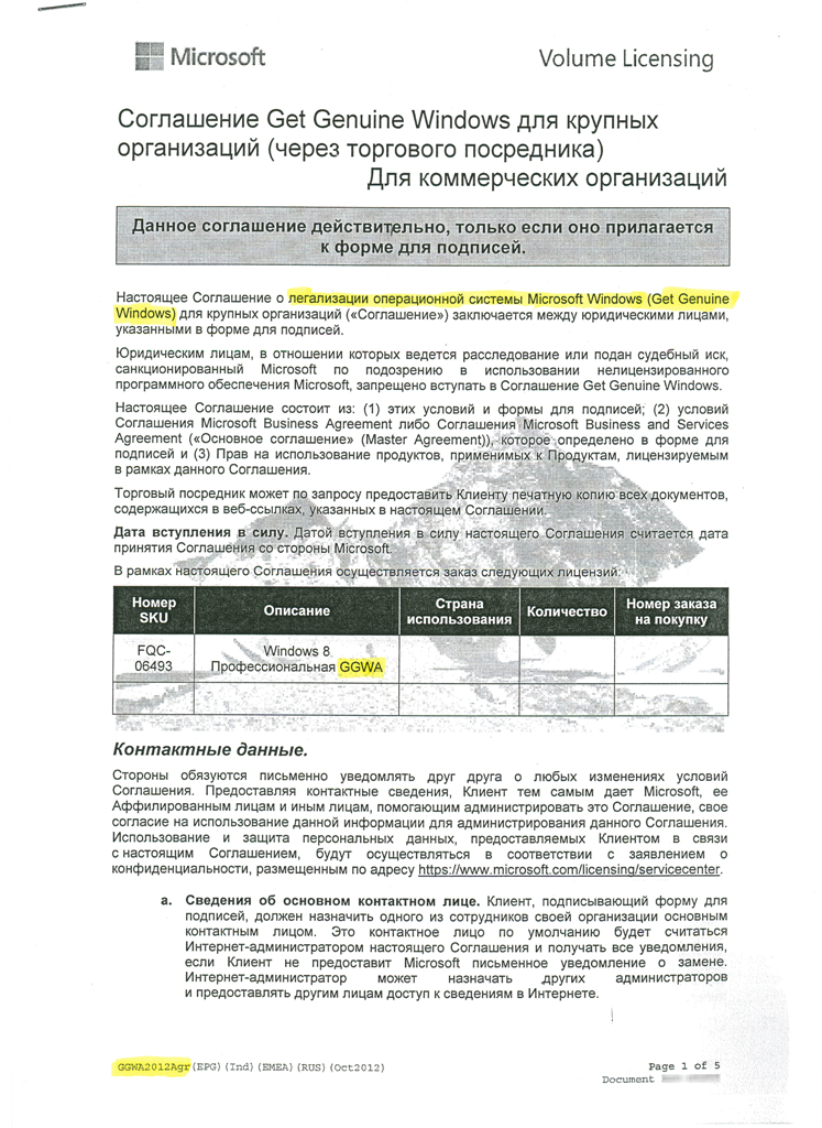 В доп.соглашении на OLP-лицензии Windows 8 Pro GetGenuine сказано: ---------- .... В соответствии с программой Microsoft Get Genuine Windows Клиенту предоставляется возможность единовременного приобретения у торгового представителя лицензий на полную версию операционной системы Microsoft для Настольных компьютеров для имеющихся у Клиента Настольных компьютеров, которым требуются надлежащие лицензии. .... Клиент соглашается с тем, что Настольные компьютеры, приобретаемые им после даты вступления в силу настоящего Дополнительного соглашения, будут приобретаться с полными и подлинными версиями операционной системы настольного компьютера. .... ---------- Из написанного следует, что лицензии GGWA предназначены правообладателем (Microsoft) для приобретения на ПК, которые по оценке клиента (а чьей же еще?) нуждаются в таких лицензиях. Сколько ПК нуждаются в лицензиях GetGenuine на вашем предприятии - столько лицензий ваше предприятие должно приобрести. И это правильно, т.к. в противном случае возникала бы парадоксальная ситуация в которой не запрещалось бы оставлять нелегальные копии Windows для легализации в будущем. Если ваше предприятие уже приобрело лицензии GetGenuine на ПК, которым требовались надлежащие лицензии и вдруг решила снова приобрести лицензии GetGenuine на какие-то другие ПК, то вам следует найти ответ на вопрос - какова причина появления потребности в надлежащих лицензиях на этих других ПК? Эта причина не должна противоречить условиям доп.соглашения. |