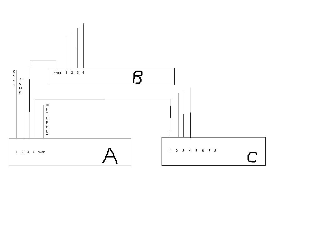В наличии имеется кабельный роутер [A] TP-Link TL-R400 (номер точно не помню) к которому подключено два компа через разъемы 1 и 2, к 3 подключен [b] D-LINK (древний) на который и-нет подается через wan и подключено 4 компа. С 4 гнезда TP-Link и-нет пошел на пассивный свич [C] ASUS где подключено еще 3 компа. Все подключения показаны на схеме. Проблема вот в чем. Везде компы подключены между собой по сетке. Комп подключенный к роутеру [C] видит компы с роутера [b] и наоборот. А вот комп с роутера [A] не видит по сетке компы с роутера [b]. В чем проблема и как ее решить?