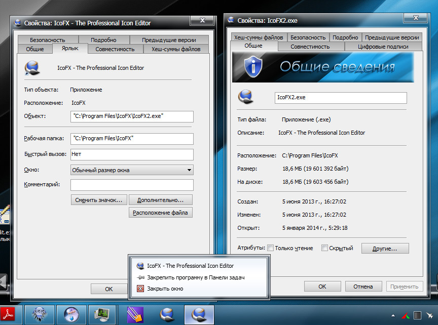 прикрепил картинку: 1ое свойства ярлыка 2ое свойства процесса 3 возможность прикрепления хотя пути нахождения программы одинаковые.. и так со всеми программами из данной директории