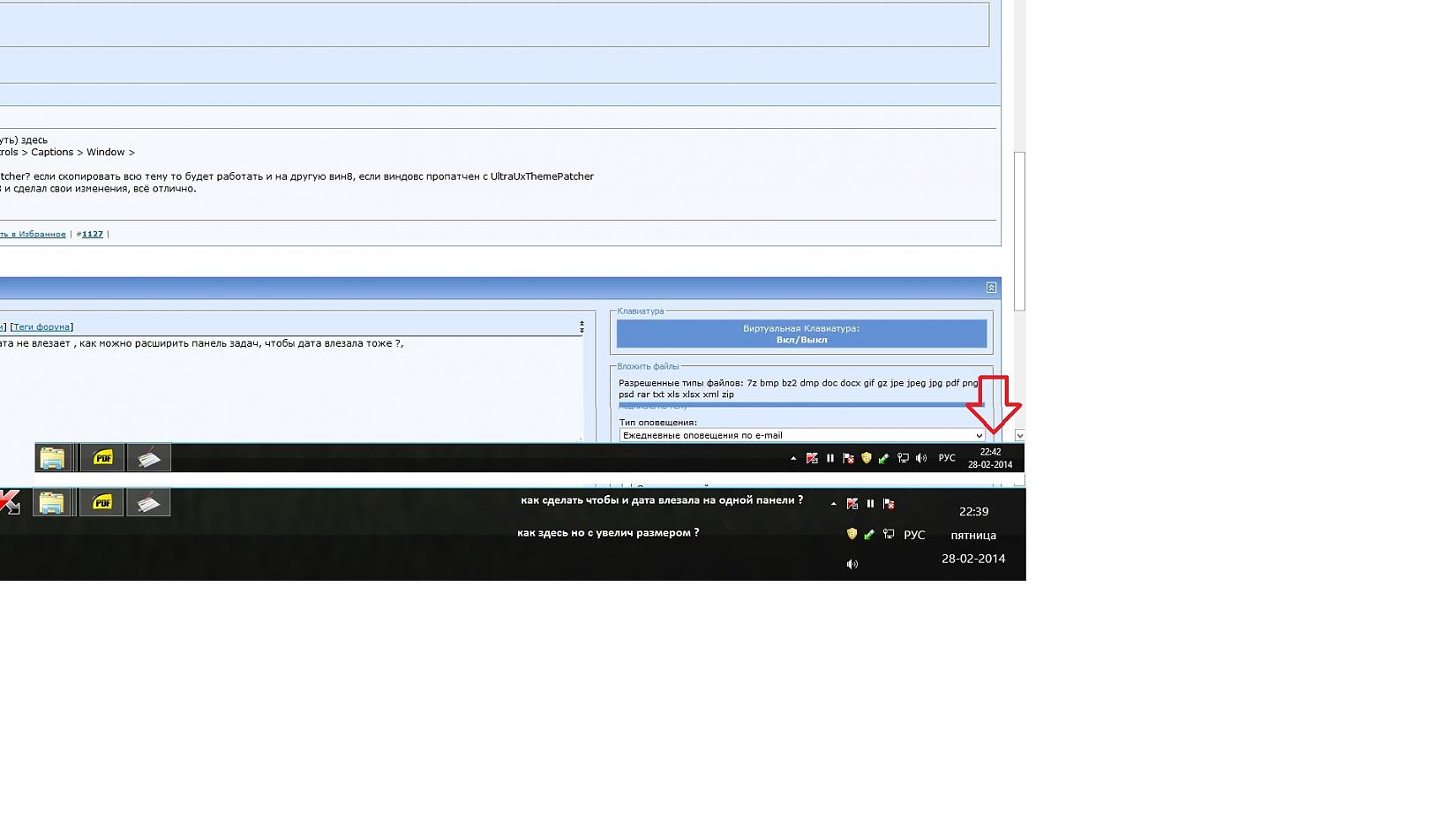 Профиль | Отправить PM | Цитировать 1) увеличил только масштаб ,размер с 9 шрифта на 12 шрифт , теперь только дата не влезает , как можно расширить панель задач, чтобы дата влезала тоже ?,