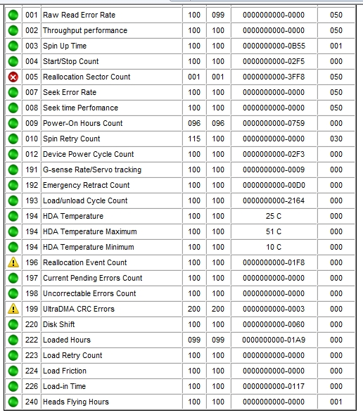 Имеется ноут Samsung Параметры СМАРТ такие: 1,Raw Read Error Rate,51,1,1,Отказ: Возможна потеря данных,36520,0,Включено 2,Throughput Performance,0,252,252,ОК (Всегда проходит),0,0,Включено 3,Spin Up Time,25,89,87,OK,3406,0,Включено 4,Start/Stop Count,0,98,98,ОК (Всегда проходит),2761,0,Включено 5,Reallocated Sectors Count,10,252,252,OK,0,0,Включено 7,Seek Error Rate,51,252,252,OK,0,0,Включено 8,Seek Time Performance,15,252,252,OK,0,0,Включено 9,Power On Time Count,0,100,100,ОК (Всегда проходит),6478,0,Включено 10,Spin Retry Count,51,252,252,OK,0,0,Включено 11,Drive Calibration Retry Count,0,100,100,ОК (Всегда проходит),84,0,Включено 12,Drive Power Cycle Count,0,98,98,ОК (Всегда проходит),2778,0,Включено 191,G-Sense Error Rate,0,98,98,ОК (Всегда проходит),21262,0,Включено 192,Power off Retract Cycle Count,0,252,252,ОК (Всегда проходит),0,0,Включено 194,Disk Temperature,0,61,39,ОК (Всегда проходит),61; 39,0,Включено 195,Hardware ECC Recovered,0,100,100,ОК (Всегда проходит),0,0,Включено 196,Reallocation Event Count,0,252,252,ОК (Всегда проходит),0,0,Включено 197,Current Pending Sector Count,0,252,100,ОК (Всегда проходит),0,0,Включено 198,Off-Line Uncorrectable Sector Count,0,252,252,ОК (Всегда проходит),0,0,Включено 199,Ultra ATA CRC Error Count,0,200,200,ОК (Всегда проходит),0,0,Включено 200,Write Error Rate,0,100,100,ОК (Всегда проходит),832,0,Включено 223,Load/Unload Retry Count,0,100,100,ОК (Всегда проходит),84,0,Включено 225,Load/Unload Cycle Count,0,99,99,ОК (Всегда проходит),18063,0,Включено Смущает первый параметр, при перезагрузки ноута выходит сообщение что винт скоро выйдет из строя, предлагает архивацию, обращать ли на это внимание или просто откл. оповещение |