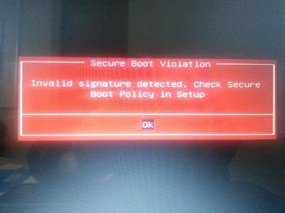 vanru, после сброса настроек при включении ноутбука выдает ошибку "invalid signature detected. Check secure boot policy in setup" (едействительная подпись обнаружено. Проверьте надежность крепления политику загрузки в настройках) и выкидывает в биос.