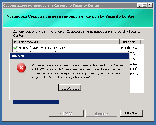 Пытаюсь установить на Windows Server 2008R2 Standart сервер администрирования Kaspersky Security Center выползает ошибка: