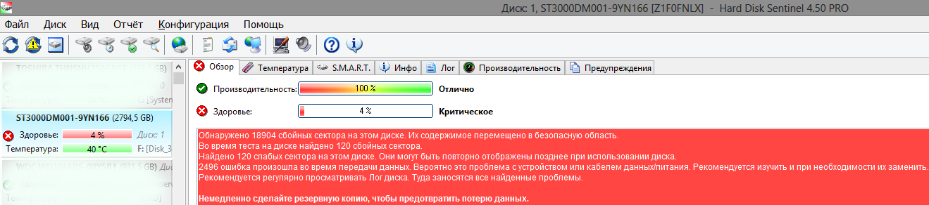Профиль | Сайт | Отправить PM | Цитировать Seagate ST3000DM001, куплен клиентом на аукре с гарантией в месяц, скрины с виктории и других со смартом и сканом прилагались. Не знаю, что с ним, но по прибытии клиент ничего с ним сделать не смог (юзер он, не его вина), а у меня вика показала катастрофическое состояние устройства и 342 текущих BAD'а, hard disk sentinel оценил жизнеспособность в 4% и предложил выкинуть в мусор. Благо дело, продавец не отказался от своих слов и предложил заменить на другой, с соотв. доплатой.