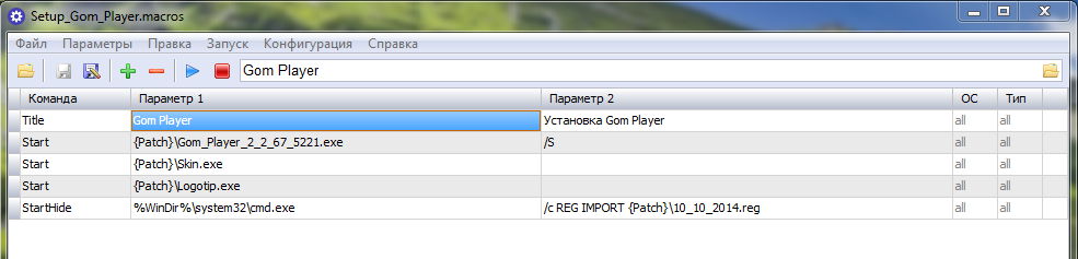 Первая колонка «Команда» - непосредственно сама команда, выбирается из выпадающего списка. Вторая и третья колонка «Параметр 1» и «Параметр 2» - заполняются в зависимости от команды. Если команда «Copy», то «Параметр 1» это что копируем, а «Параметр 2» куда копируем. Если команда «Start», то «Параметр 1» это путь к приложению, а «Параметр 2» ключи запуска, подробнее в описании команд. В колонке «ОС» указывается версия ОС для которой предназначена команда, по умолчанию для всех ОС (значение «All»). В колонке «Тип» указывается разрядность ОС, по умолчанию для всех (значение «All»). В последней колонке отображается результат выполнения.