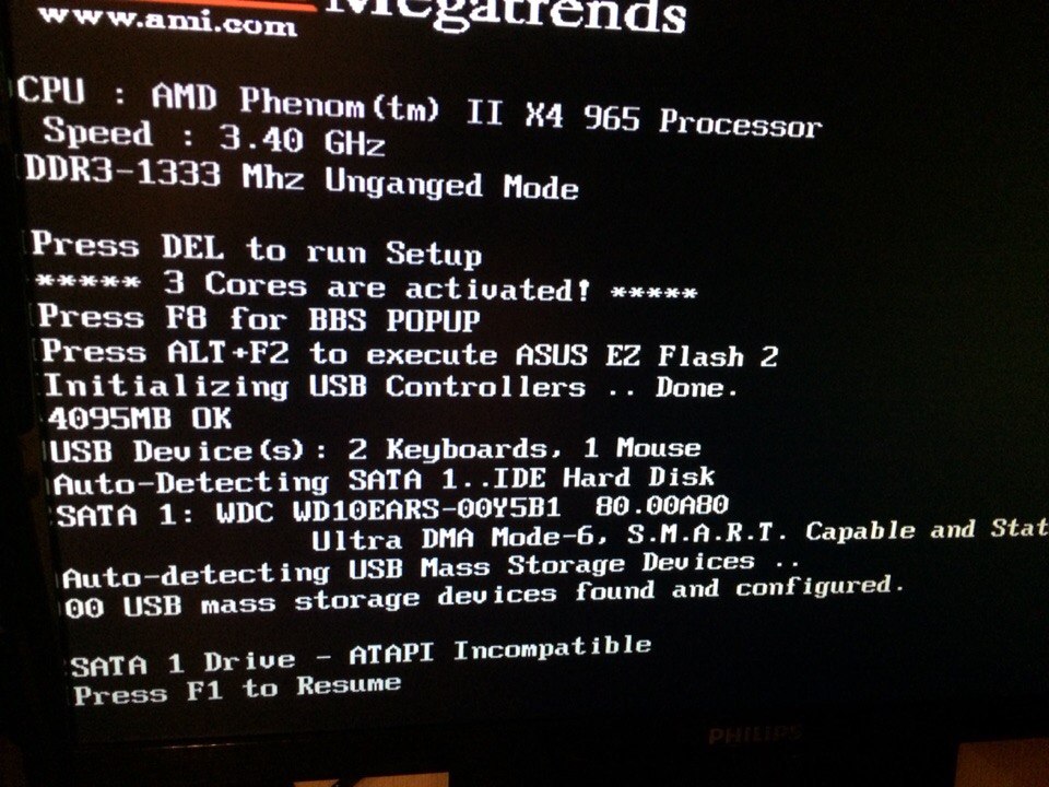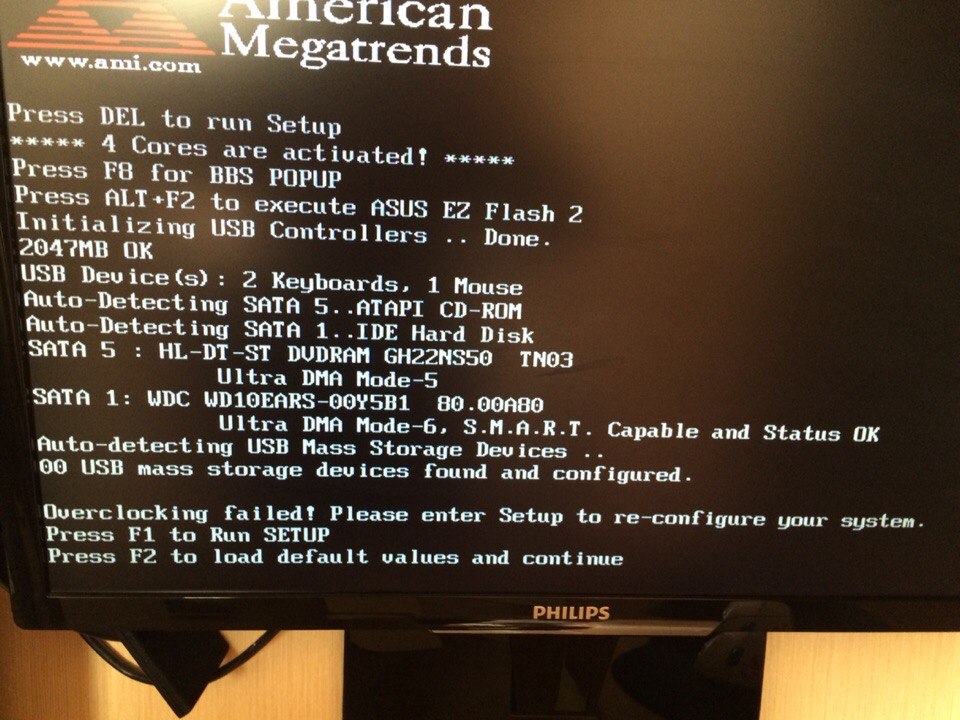 После нескольких перезагрузок показывает либо: 1) Overclocking failed! Please enter Setup to re-configure your system Press F1 to Run SETUP Press F2 to load deafault values and continue После нажатия F1 попадаем в биос, после нажатия F2 получаем просто постоянную перезагрузку. Либо пишет: 2) Detecting drives; Done; No drives found. Быстро мелькая на черном экране и дальше идет перезагрузка в нон-стоп режиме ----------------------------------------------------------------- Прикладываю фото. БОЛЬШАЯ ПРОСЬБА помочь как решить проблему? ================================= Материнская плата: Asus M4A89GTD pro Операционная система: Windows 7 2 планки оперативки по 1ГБ Жесткий на 500 ГБ Варианты Из того что уже пробовал. На фото скрин после отключения DVD-ROMa Также пробовал отключать и загружаться без жесткого диска. При загрузке с Live CD на жесткий диск заходит - соответственно он работает. Сбрасывать CMOS перемычкой пробовал, ноль реакции. Батарейку на несколько часов вытаскивал из материнской платы - не помогает. Блока питания проверить нет другого, но вряд ли сгорел, так как стоит хороший фильтр перед ним. С настройками биос: overlocing в manual стоит. в настройках жестких дисков ставил вместо auto - disabled Может что-то еще стоит поменять в БИОС? И еще , что предшествовало проблеме, но на что не особо стоит обращать внимание: подключали HDD внешний через USB , не совсем исправный, возможно он как-то повлиял. До этого пять дней назад стояла Windows 8.1 , все драйвера после переустановки накатил. |