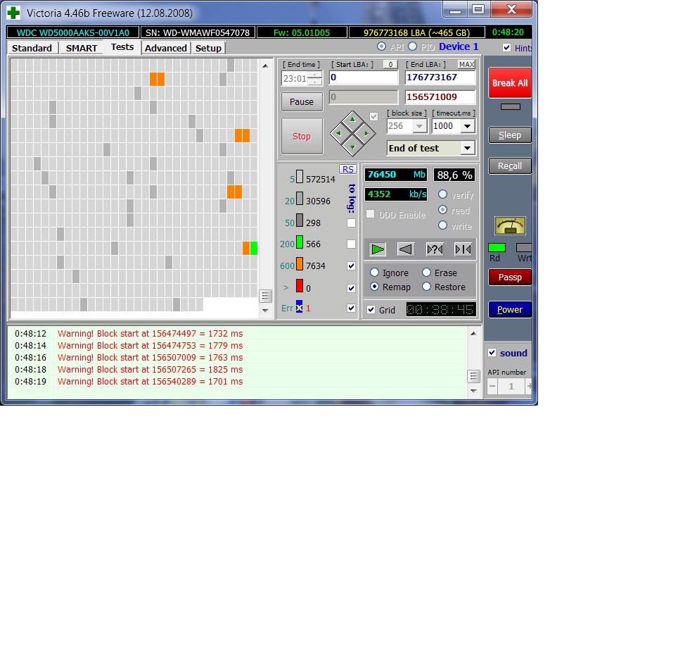 Frost_WD, Я по дилетантски смотрю на SMART, вижу только много очень медленных чтений или открываний ( как правильно?), БАДов только один на 50ГБ просканированного из 500. И по 600 м.\с. аж 7600 отметок, на 50 Гб. Но вроде должен работать. Информацию с него снимали 50 Гб.нужных, больше суток. Стояла там ХР все фрогматировал, сделал одним томом, думал может вирус. Попробовал поставить ХР 3 часа только копировались файлы. Пока ничем не закончилось, встало по причине запроса установщика от ХР файлов ASMS,
