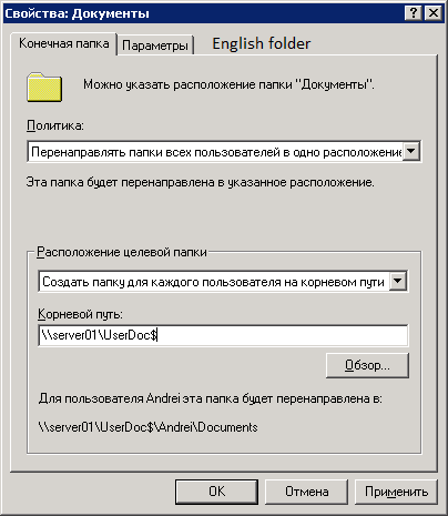 desktop.ini только обзывает англ. папки русскими именами , например путь где лежит файл: C:\Users\Default\AppData\Roaming\Microsoft\Windows\Start Menu\Programs\Accessories\desktop.ini выглядит. C:\пользователи\Default\AppData\Roaming\Microsoft\Windows\Главное меню\Программы\Стандартные\desktop.ini На данный момент на сервере01 есть 2 папки: Мои документы (отображается как My Documents на сервере и Мои документы для пользователя.) и появилась, Documents (отображается как Documents на сервере и Documents для пользователя.) В ней появились папки без файлов из старой Мои документы Ошибка пенераправления=0x1211 по прежнему есть. Замечу что я назначил тому же пользователю, ту же самую папку , но в новой политике GPO . Бессмысленно я понимаю но это нужно для тестирования. которое теперь не идёт дальше. |