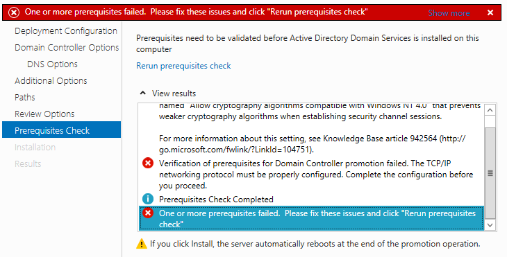 Здравствуйте! Столкнулся с проблемой. Стоит VMware 11. На неё поставил Windows Server 2012 R2. При создании нового леса, перед завершающим этапом выдаёт то, что на картинке. Подскажите пожалуйста как исправить?