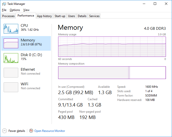 Windows 10 Pro en-us 64-bit 10.0.14352.1002 Lenovo G50-40 (4GB DDR3, Core i3-4005U) Постоянно растет Commited memory, сейчас uptime 1 день 12 часов, выделено 9,6GB, еще день и будет выделенно 13. Тогда уже и браузер не откроется. Причем физическая память сейчас занята на половину, 2 гига или около того, еще почти 2 свободно. Почему растет commited - непонятно. Нет процессов которые память жрут, paged и non-paged pool - обычно около 400 и 200 соотвественно. |