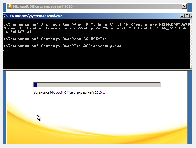 И записал образ с последующей проверкой в виртуальной машине. Проблема вот в чём: при первом входе в учётку «Boss» открывается окно командной строки (рабочий стол с ярлыками и пуск я не наблюдаю, только одноцветный фон - скриншот) и успешно инсталлируется Office. А вот файл import.reg отрабатывается не полностью! В нём у меня находятся скорректированные параметры временных зон, отображение скрытых и системных файлов и закрепление нужных мне ярлыков в меню Пуск. Таймзоны корректируются полностью, а отображение скрытых и системных не все пункты и вообще без изменений список ярлыков в Пуске. После якобы отработки скрипта грузится рабочий стол, одновременно с этим в верхнем углу отображается процесс установки "личных параметров". И если файл import.reg запустить или импортировать из загрузившейся оболочки, то всё прекрасно отрабатывается! Как исправить положение? Да, и по задумке коррекция временных зон априори идёт для всех, а вот отображение скрытых файлов и папок должно быть только у пользователя «Boss», а вот закреплённые ярлыки в Пуске тоже как-то автоматически надо сделать и пользователю с ограниченными правами... но до этого я пока не дошёл т.к. возникли вышеизложенные проблемы. |