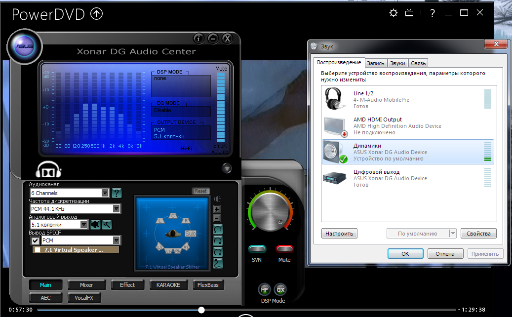 Установил себе звуковую карту Asus Xonar DG с целью выведения звука 5.1 на домашний кинотеатр. Ползунки в "звуковых устройствах" панели управления и Xonar DG AudioCenter бегают, но звука нет. Звук вывожу по оптическому кабелю, поскольку на ресивере ДК нет входов для джеков. Переустановка драйвера и отключение встроенной звуковой карты в биосе не помогло( Почитал темы по подобной проблеме на форуме и не нашел для себя решения. Мат. плата ASRock M3N78D. Скриншот прилагаю. Буду признателен за помощь. |