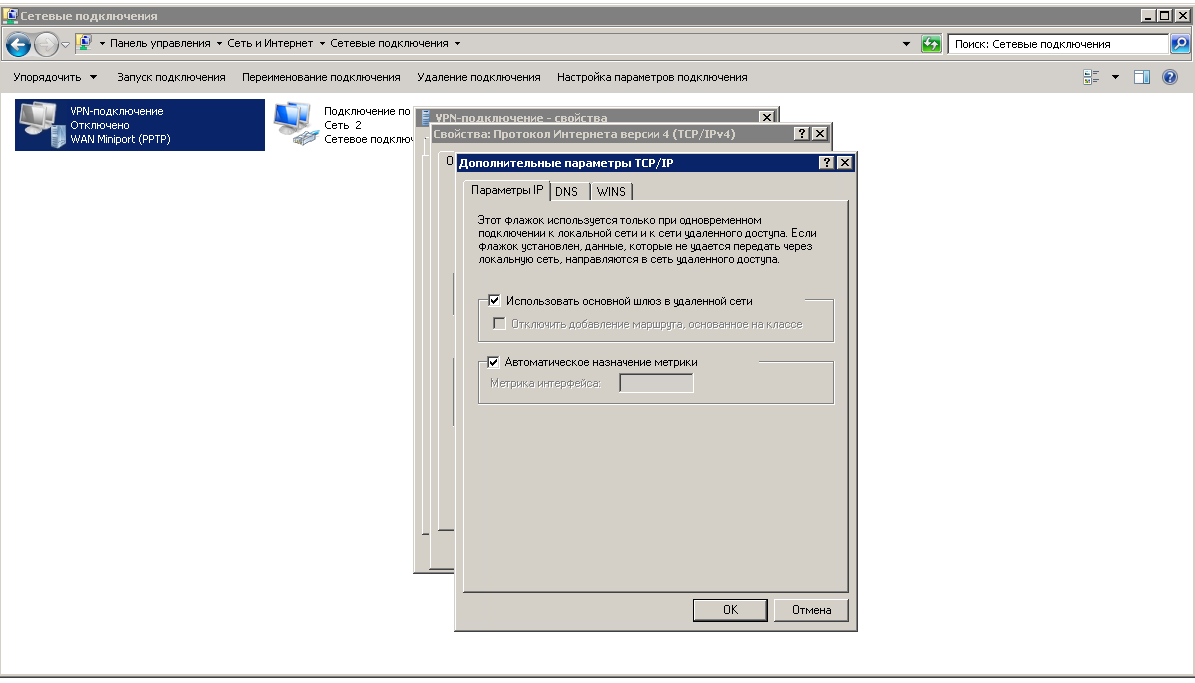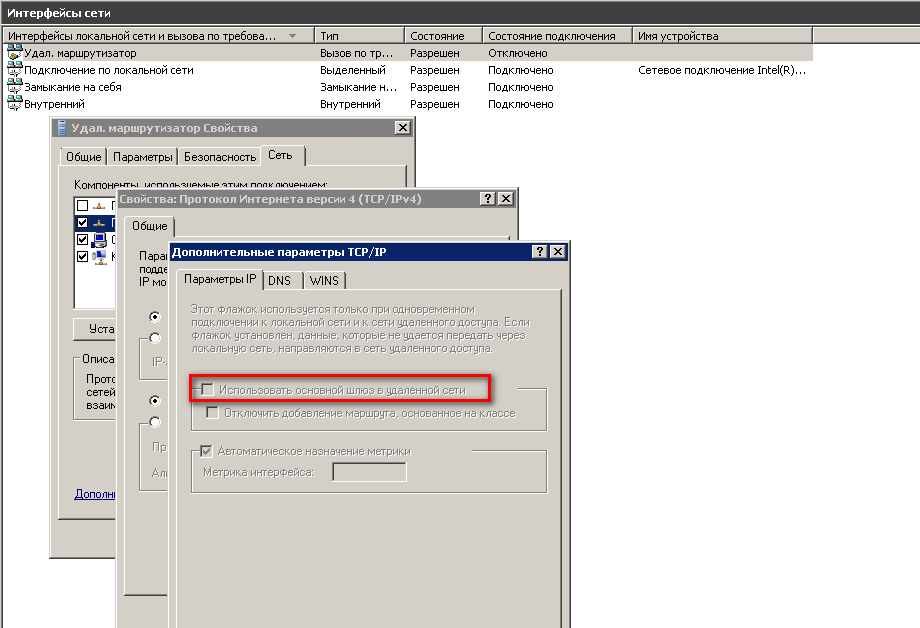 2008 R2 - не активна галочка "использовать основной шлюз в удаленной сети" в подключении "удале