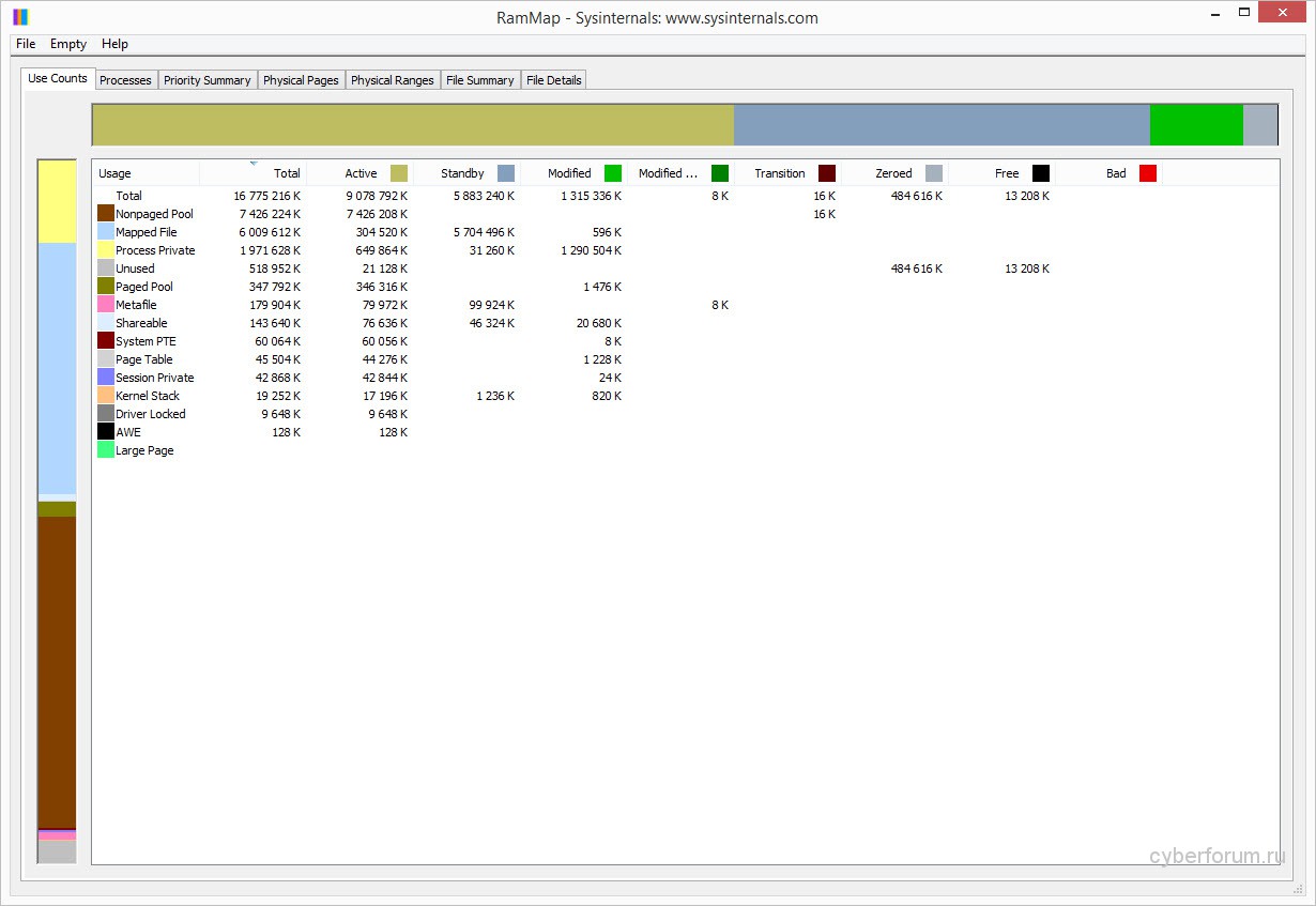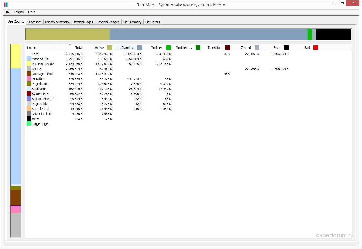 Профиль | Отправить PM | Цитировать Братцы нужна помощь, вообщем если комп работает целый день, то к вечеру память забивается до 80%, хотя если открыть диспетчер, то там от силы гига на 3.... (у меня 16). Прочитал форум, видел что такие проблемы были, установил прогу RamMap, но я в ней ничего не шарю =( Началось это недавно, раньше всё было норм, комп работал и 2 дня подряд и даже 3... Ну вообщем I NEED HELP!!!