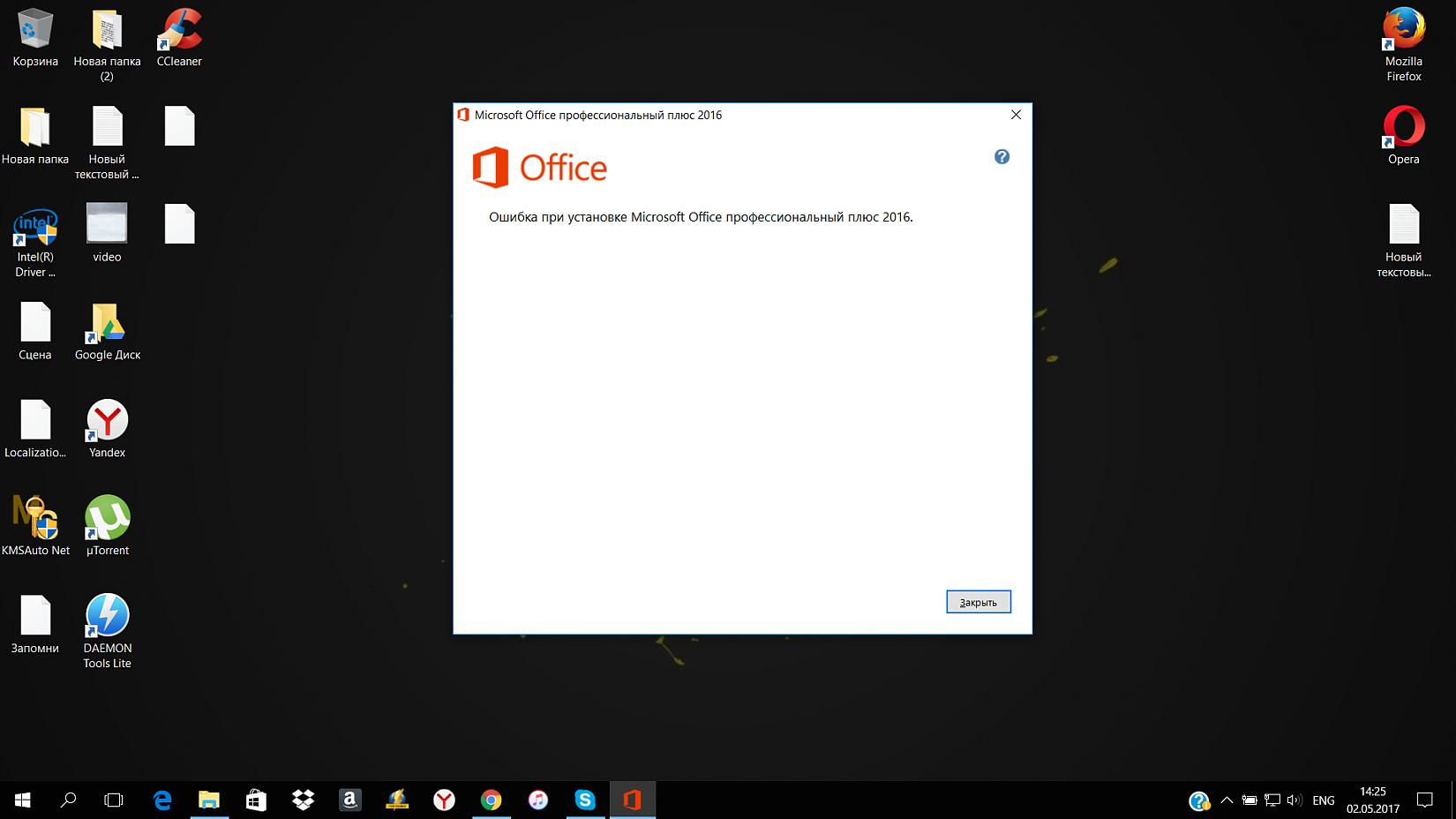 Изначально стоял пакет профессиональный плюс 2016, из-за невозможности его активации ни одним активатором был удален, согласно инструкциям, представленным на официальном сайте MS. После этого были скачаны как сборки, так и оригинальные версии пакета MO 2016 профессиональный плюс. Ни один пакет не может установиться корректно. Установка начинается, доходит до какого то момента и дальше появляется окно с ошибкой на скрине. Если кто то сталкивался с подобным, то очень бы хотелось знать, как это решить.
