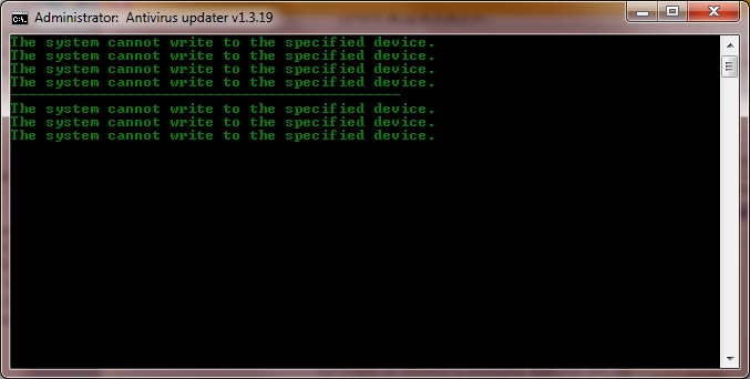 Сделай скриншот консольного окна, чтоб видеть все что там пишется после запуска скрипта. Скрипт распаковывает свои файлы в %WinDir%\Temp\Antivirus_updater - есть права на запись в этот каталог ? Антивирус не блокирует ? |