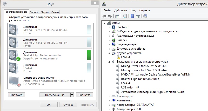 Добрый день. Решил обновить драйвера для внешней звуковой карты. Теперь имею непонятный набор устройств (скриншот). Лишнее удалить не получатся. Удаляется всё. Помогите пожалуйста решить проблему. Хотелось бы на 100% удалить устройство со всеми хвостами с windows и установить с нуля. Раньше было просто Mixing Driver и US 4x4. При этом в диспетчере устройств висит одно установленное устройство US 4x4 а второе нет. Я походу запутал систему этими переустановками.