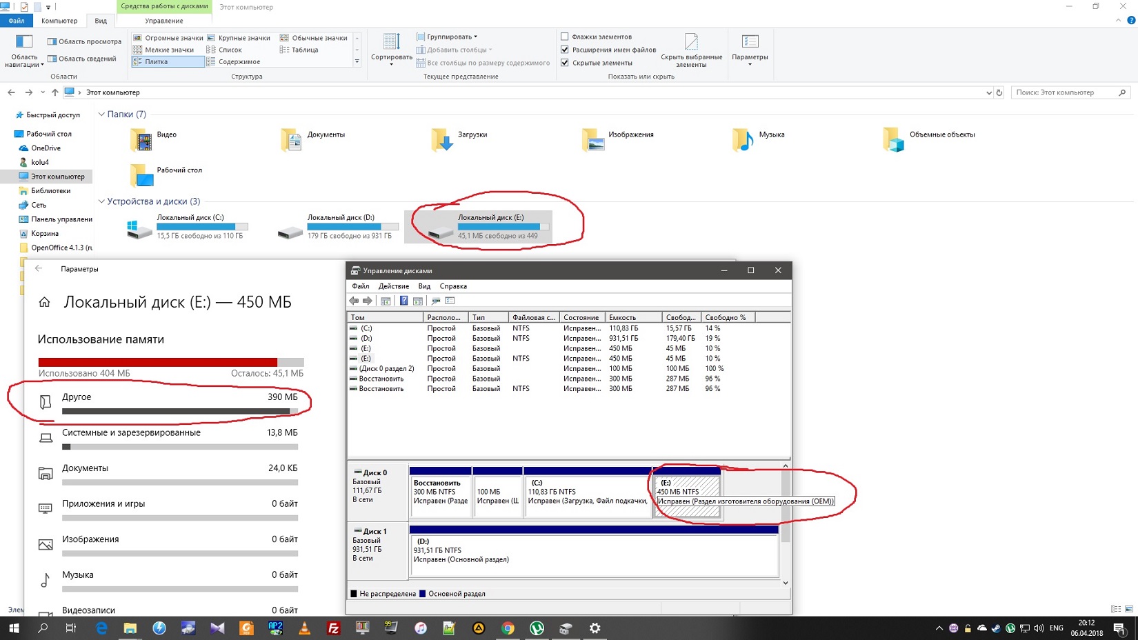 В системнике два физических диска, первый ssd - на нем система, второй hdd там файлопомойка. Новый раздел появился на ssd.Вопросы: 1 Откуда он взялся? Написано что раздел изготовителя оборудования. Но его не было видно, и после обновления он стал виден? 2 Почти вся память на нем занята. Раздел другое (см. скриншот) это что? Там нет ни папок ни файлов. 3 Как вернуть все взад? Если раздел изготовителя то просто скрыть его, как? |