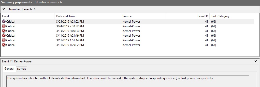Вот частота этих ошибок. Компьютер работает с утра до ночи каждый день. Не играю, просто режим "офисного" использования. То есть последний раз было 4 дня назад, причем два раза с периодичностью 2 часа. Меня, конечно, это сильно расстраивает, так как не могу нормально работать и т.д., боясь потерять данные в любой момент. В соседней комнате стоит компьютер сына (с очень похожей конфигурацией, тот же корпус, та же ОС) -- никаких проблем нет. |