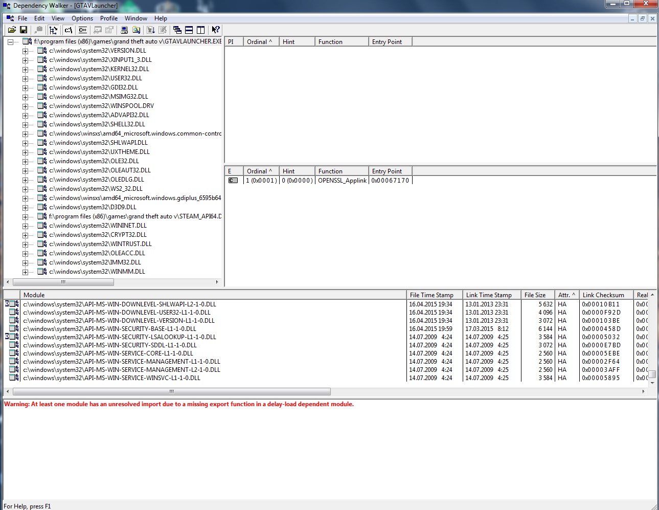 Приветствую! Установил GTA5 ( win 7 64) , при запуске выдает 0xc000007b , весь день танцевал с бубном , ничего не помогает , в проге depends был файл xinput1_3 x86 вместо х64 , поправил на х64. Также ругался на 15 файлов формата api-ms-win-appmodel-runtime-l1-1-0 (фото) их установил, но при запуске лаунчера осталось сообщение -Warning: At least one module has an unresolved import due to a missing export function in a delay-load dependent module.