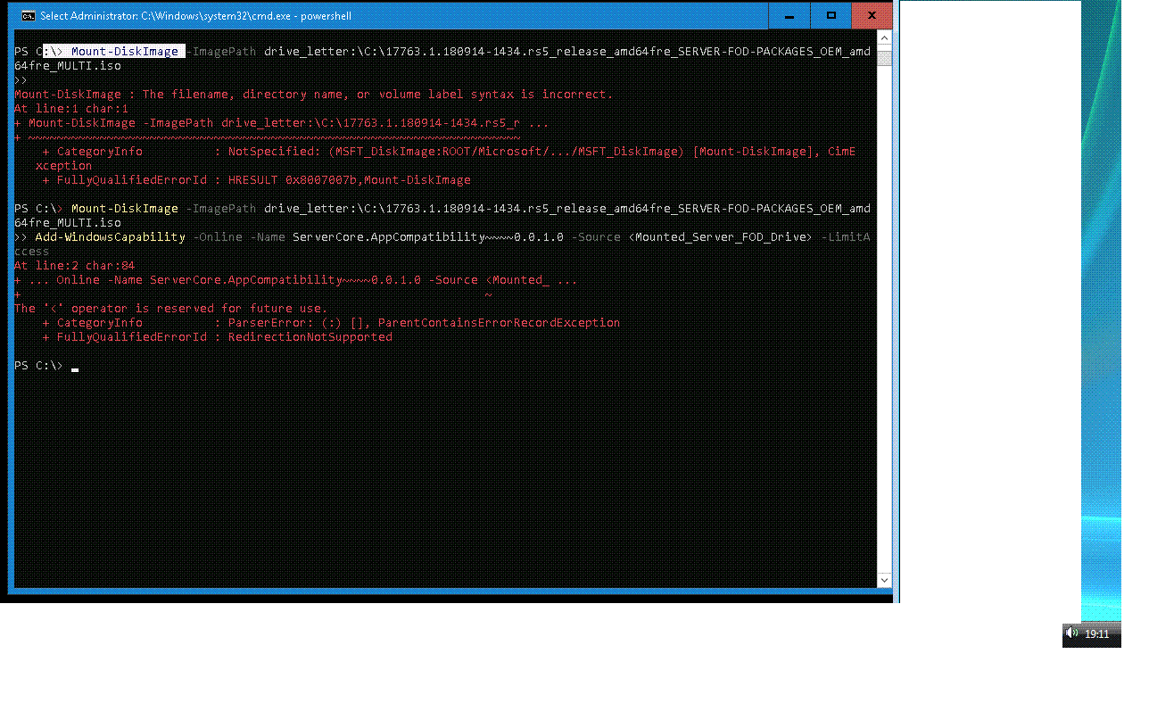 - зачем вы перед именем раздела диска пишете "drive_letter" ? В вашем случае команда должна быть такой: Mount-DiskImage -ImagePath C:\17763.1.180914-1434.rs5_release_amd64fre_SERVER-FOD-PACKAGES_OEM_amd64fre_MULTI.iso |