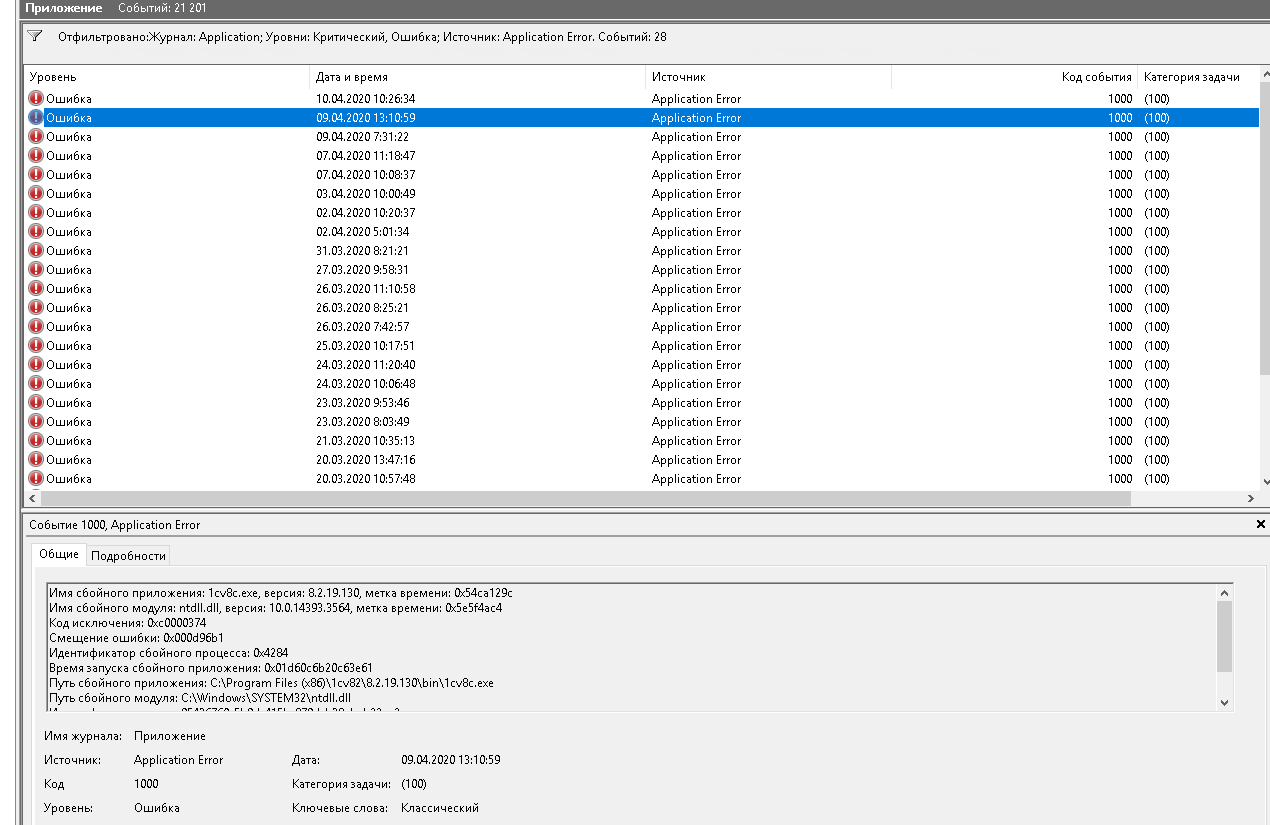 вылетает программа 1с со всех компьютеров. не могу понять в чём проблема. В событиях нашёл это. Имя сбойного приложения: 1cv8c.exe, версия: 8.2.19.130, метка времени: 0x54ca129c Имя сбойного модуля: ntdll.dll, версия: 10.0.14393.3564, метка времени: 0x5e5f4ac4 Код исключения: 0xc0000374 Смещение ошибки: 0x000d96b1 Идентификатор сбойного процесса: 0x3b78 Время запуска сбойного приложения: 0x01d60dd02bd892b0 Путь сбойного приложения: C:\Program Files (x86)\1cv82\8.2.19.130\bin\1cv8c.exe Путь сбойного модуля: C:\Windows\SYSTEM32\ntdll.dll Идентификатор отчета: 6c2476a9-8e5c-4643-ba09-df4bdd164062 Полное имя сбойного пакета: Код приложения, связанного со сбойным пакетом: Спасибо. |