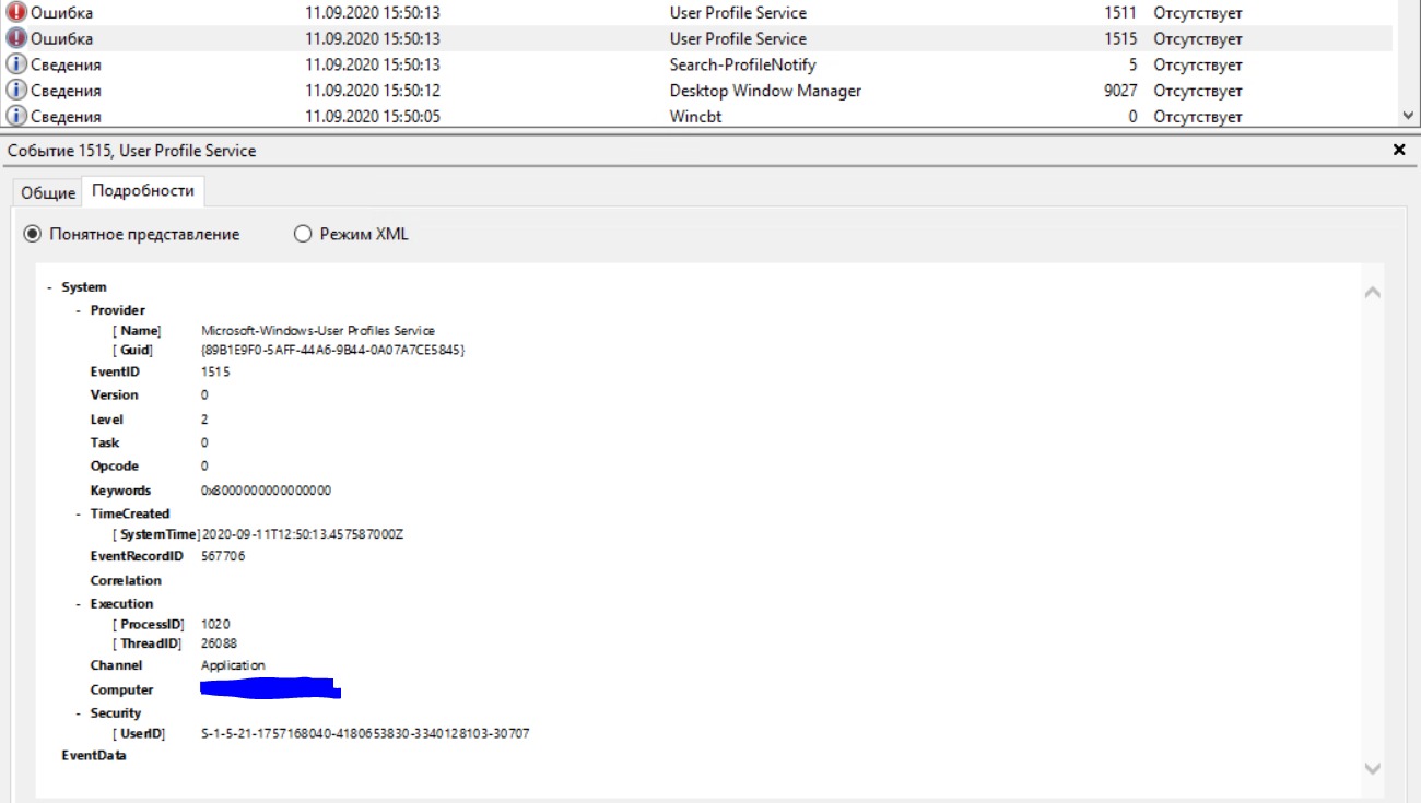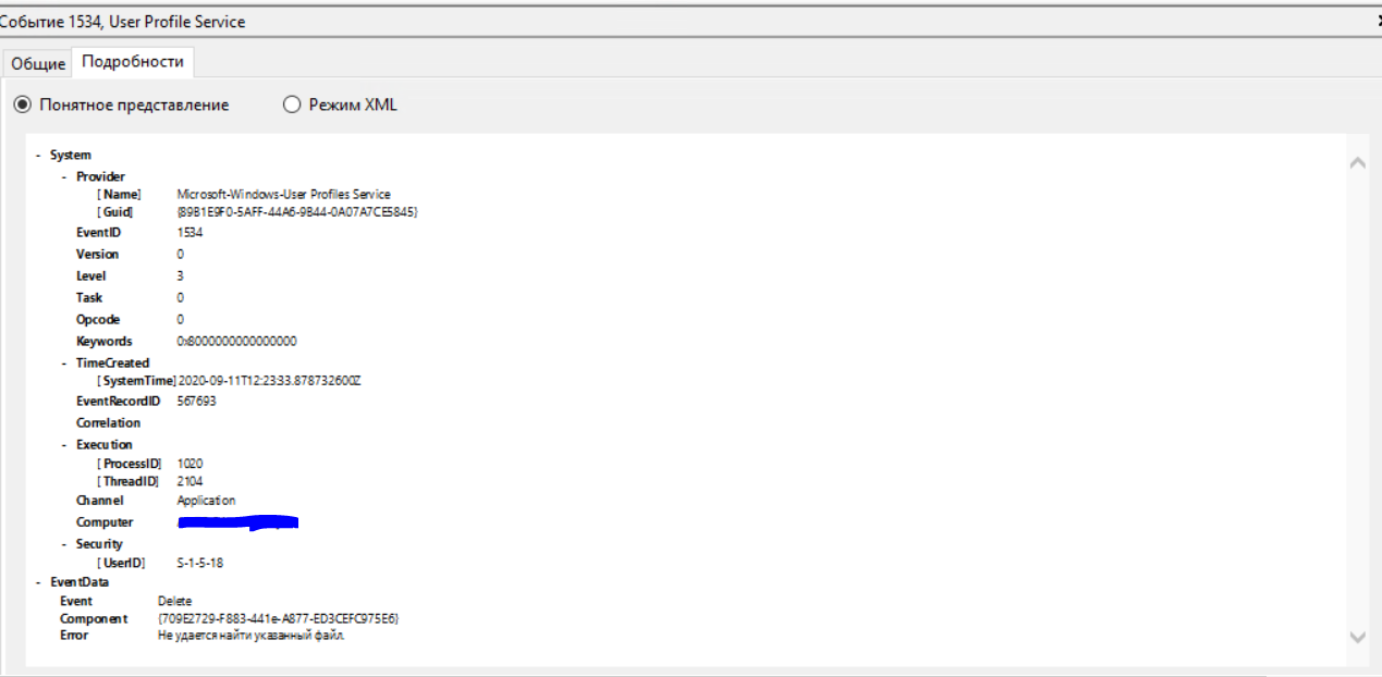 Хронология: 1 Событие: Файл реестра C:\Users\проблемный юзер\ntuser.dat загружен в HKU\S-1-5-21-1757168040-4180653830-3340128103-30707. Код события 5 System - Provider [ Name] Microsoft-Windows-User Profiles Service [ Guid] {89B1E9F0-5AFF-44A6-9B44-0A07A7CE5845} EventID 5 Version 0 Level 4 Task 0 Opcode 0 Keywords 0x4000000000000000 - TimeCreated [ SystemTime] 2020-09-11T12:50:13.221542400Z EventRecordID 59025 Correlation - Execution [ ProcessID] 1020 [ ThreadID] 26088 Channel Microsoft-Windows-User Profile Service/Operational Computer ----------------- - Security [ UserID] S-1-5-18 - EventData File C:\Users\юзер\ntuser.dat Key S-1-5-21-1757168040-4180653830-3340128103-30707 2 Событие: Файл реестра C:\Users\проблемный юзер\AppData\Local\Microsoft\Windows\UsrClass.dat загружен в HKU\S-5-21-1757168040-4180653830-3340128103-30707_Classes. Код события 5 - System - Provider [ Name] Microsoft-Windows-User Profiles Service [ Guid] {89B1E9F0-5AFF-44A6-9B44-0A07A7CE5845} EventID 5 Version 0 Level 4 Task 0 Opcode 0 Keywords 0x4000000000000000 - TimeCreated [ SystemTime] 2020-09-11T12:50:13.284763100Z EventRecordID 59026 Correlation - Execution [ ProcessID] 1020 [ ThreadID] 26088 Channel Microsoft-Windows-User Profile Service/Operational Computer ------------ - Security [ UserID] S-1-5-18 - EventData File C:\Users\юзер\AppData\Local\Microsoft\Windows\\UsrClass.dat Key S-1-5-21-1757168040-4180653830-3340128103-30707_Classes 3 Событие: Получено уведомление о входе пользователя для сеанса 560. Код события 1 - System - Provider [ Name] Microsoft-Windows-User Profiles Service [ Guid] {89B1E9F0-5AFF-44A6-9B44-0A07A7CE5845} EventID 1 Version 0 Level 4 Task 0 Opcode 0 Keywords 0x4000000000000000 - TimeCreated [ SystemTime] 2020-09-11T12:50:13.451707100Z EventRecordID 59027 Correlation - Execution [ ProcessID] 1020 [ ThreadID] 17412 Channel Microsoft-Windows-User Profile Service/Operational Computer -------------- - Security [ UserID] S-1-5-21-1757168040-4180653830-3340128103-30707 - EventData Session 560 4 Событие: Файл реестра C:\Users\TEMP.имя_домена\ntuser.dat загружен в HKU\S-1-5-21-1757168040-4180653830-3340128103-30707. Код события 5 System - Provider [ Name] Microsoft-Windows-User Profiles Service [ Guid] {89B1E9F0-5AFF-44A6-9B44-0A07A7CE5845} EventID 5 Version 0 Level 4 Task 0 Opcode 0 Keywords 0x4000000000000000 - TimeCreated [ SystemTime] 2020-09-11T12:50:13.785409200Z EventRecordID 59028 Correlation - Execution [ ProcessID] 1020 [ ThreadID] 26088 Channel Microsoft-Windows-User Profile Service/Operational Computer --------------- - Security [ UserID] S-1-5-18 - EventData File C:\Users\TEMP.имя_домена\ntuser.dat Key S-1-5-21-1757168040-4180653830-3340128103-30707 5 Событие: Тип входа RDS. Расположение локального профиля C:\Users\TEMP.имя_домена Тип профиля: Temporary - System - Provider [ Name] Microsoft-Windows-User Profiles Service [ Guid] {89B1E9F0-5AFF-44A6-9B44-0A07A7CE5845} EventID 67 Version 0 Level 4 Task 0 Opcode 0 Keywords 0x4000000000000000 - TimeCreated [ SystemTime] 2020-09-11T12:50:13.881035800Z EventRecordID 59029 Correlation - Execution [ ProcessID] 1020 [ ThreadID] 26088 Channel Microsoft-Windows-User Profile Service/Operational Computer ------------- - Security [ UserID] S-1-5-18 - EventData LogonType RDS LocalPath C:\Users\TEMP.имя_домена ProfileType Temporary 6 Событие: Файл реестра C:\Users\TEMP.имя_домена\AppData\Local\Microsoft\Windows\UsrClass.dat загружен в HKU\S-5-21-1757168040-4180653830-3340128103-30707_Classes. Код события 5 - System - Provider [ Name] Microsoft-Windows-User Profiles Service [ Guid] {89B1E9F0-5AFF-44A6-9B44-0A07A7CE5845} EventID 5 Version 0 Level 4 Task 0 Opcode 0 Keywords 0x4000000000000000 - TimeCreated [ SystemTime] 2020-09-11T12:50:13.920449800Z EventRecordID 59030 Correlation - Execution [ ProcessID] 1020 [ ThreadID] 26088 Channel Microsoft-Windows-User Profile Service/Operational Computer ---------- - Security [ UserID] S-1-5-18 - EventData File C:\Users\TEMP.имя_домена\AppData\Local\Microsoft\Windows\\UsrClass.dat Key S-1-5-21-1757168040-4180653830-3340128103-30707_Classes Следующее событие через 3 секунды: Обработано уведомление о входе пользователя для сеанса 560 - System - Provider [ Name] Microsoft-Windows-User Profiles Service [ Guid] {89B1E9F0-5AFF-44A6-9B44-0A07A7CE5845} EventID 2 Version 0 Level 4 Task 0 Opcode 0 Keywords 0x4000000000000000 - TimeCreated [ SystemTime] 2020-09-11T12:50:16.036864900Z EventRecordID 59031 Correlation - Execution [ ProcessID] 1020 [ ThreadID] 17412 Channel Microsoft-Windows-User Profile Service/Operational Computer ------------ - Security [ UserID] S-1-5-21-1757168040-4180653830-3340128103-30707 - EventData Session 560 Потом событие через 2 минуты: Получено уведомление о выходе пользователя - System - Provider [ Name] Microsoft-Windows-User Profiles Service [ Guid] {89B1E9F0-5AFF-44A6-9B44-0A07A7CE5845} EventID 3 Version 0 Level 4 Task 0 Opcode 0 Keywords 0x4000000000000000 - TimeCreated [ SystemTime] 2020-09-11T12:52:07.519111100Z EventRecordID 59032 Correlation - Execution [ ProcessID] 1020 [ ThreadID] 24580 Channel Microsoft-Windows-User Profile Service/Operational Computer ----------- - Security [ UserID] S-1-5-21-1757168040-4180653830-3340128103-30707 - EventData Session 560 Далее событие: Не удается найти описание для идентификатора события 77 из источника Microsoft-Windows-User Profile General. Вызывающий данное событие