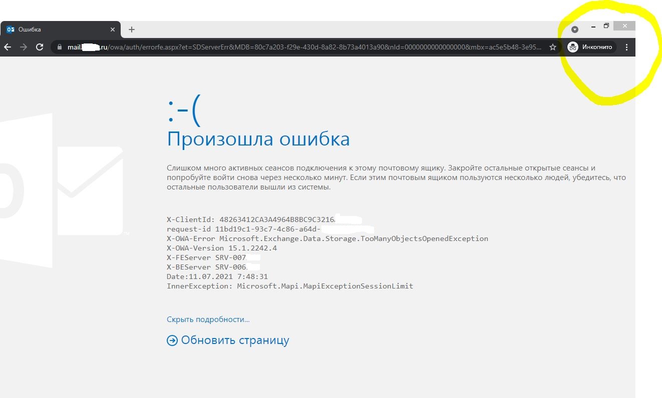Есть такая проблема. Пользователь с почтой user@contora.ru не может зайти через owa в браузере на компьютере. В телефоне заходит и там все работает. При попытке зайти в браузере на компьютере пишет про ошибку (прикрепил скрин) . При этом на компьютере, где эта ошибка я захожу в другую почту через owa, а с учеткой user@contora.ru не могу зайти и на других компьютерах – отсюда и мысли, что эти сессии можно удалить только на сервере. Сбрасывал пароль от учетки в AD. Через ecp – удалял все android-девайсы, зарегистрированные на этой почте и отключал/включал полностью доступ Outlook в Интернет – не помогает. Удалял почту на телефоне и заходил через вкладку "Инкогнито" - не помогает. Через owa больше никто не логинится в эту почту. Кто сталкивался? Как это победить?) PS: Exchange 2016, AD Заранее спасибо! |