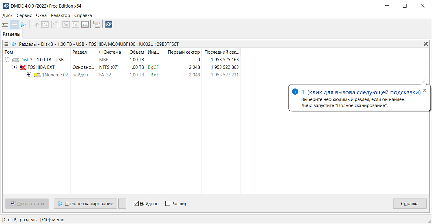 Здравствуйте. Помогите, пожалуйста, восстановить диск Toshiba 1 Tb. На диске пропали файлы после использования в телевизоре. Сделал в dmde скриншот (2022-10-09--083410) и дамп первых 100 секторов (dev3_lba0_100). Cтруктура файлов видна в разделе Toshiba EXT (если нажать Открыть том). Далее в dmde удалил раздел Toshiba EXT. Текущая картина в dmde на втором скриншоте 2022-10-09--090851. Что делать теперь?