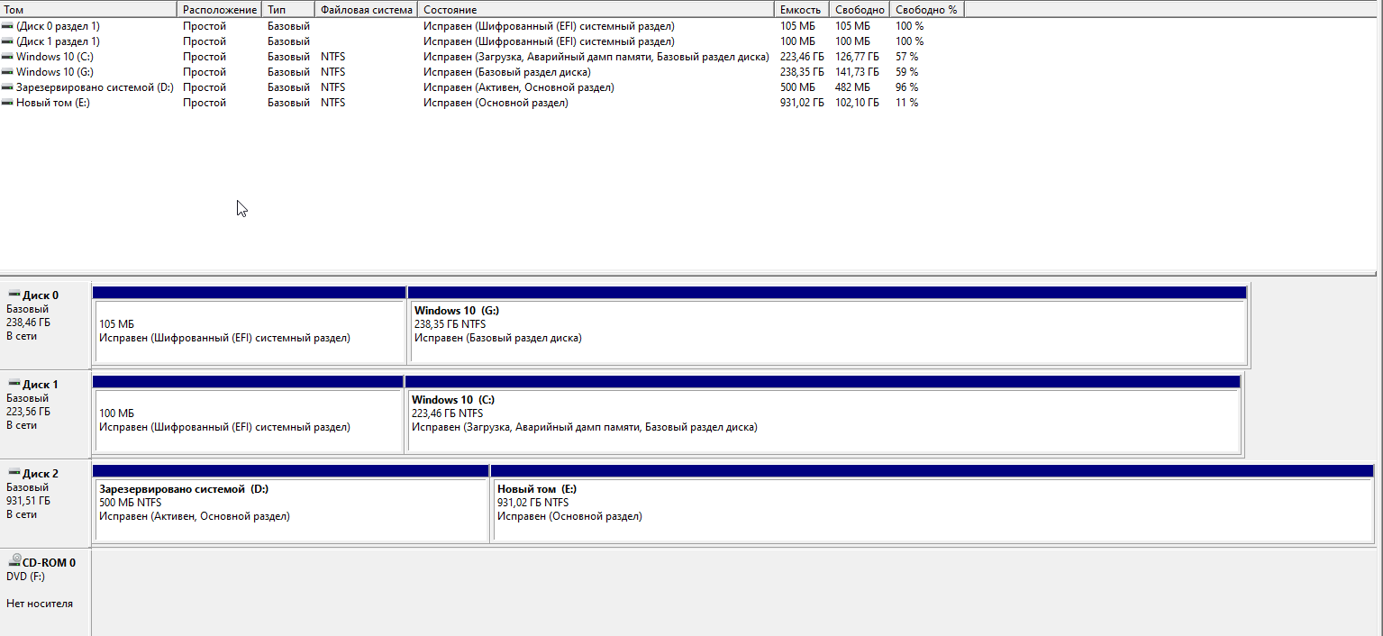 Есть Windows 10 на SSD с разметкой GPT, SSD SATA формата 2.5 Недавно приобрёл SSD М2. Поставил его, биос его видит, система видит. Для переноса использовал утилиту MiniTool Partition Wizard 9.0, система ругнулась, что винда занята и надо перезагрузить и продолжить. Перезагрузил всё прошло успешно без сбоев. С помощью БутМеню выбрал SSD M2, но дальше просто чёрный экран, ни ошибок, ни надписей, ничего, минут 10 висел и тишина. Я перезагрузился со старого SSD посмотрел в управление Дисками, всё перенеслось, буква есть у диска, но не грузится. На скриншоте Диск1, ДискС и ДискD это старый SSD, а Диск0 и ДискG это новый SSD. |