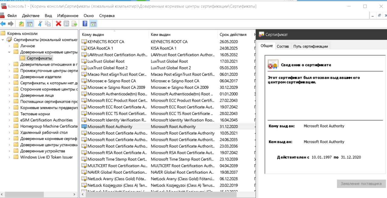 когда отозван не работает, а когда просто просрочен, все нормально. тоже самое с Microsoft Root Certificate Authority См скриншоты Если же ставить повершеллом, типа certutil.exe -generateSSTFromWU c:\PS\roots.sst $sstStore = ( Get-ChildItem -Path C:\ps\rootsupd\roots.sst ) $sstStore | Import-Certificate -CertStoreLocation Cert:\LocalMachine\Root то все в порядке! |