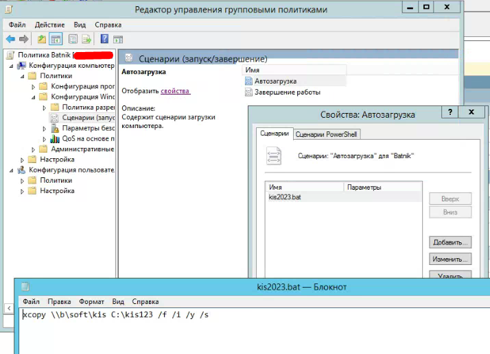 Помогите разобраться, по какой причине на клиентских машинах не выполняется батник (копирование папки с сетевого доступа на диск с) Скриншоты настроек во вложении |